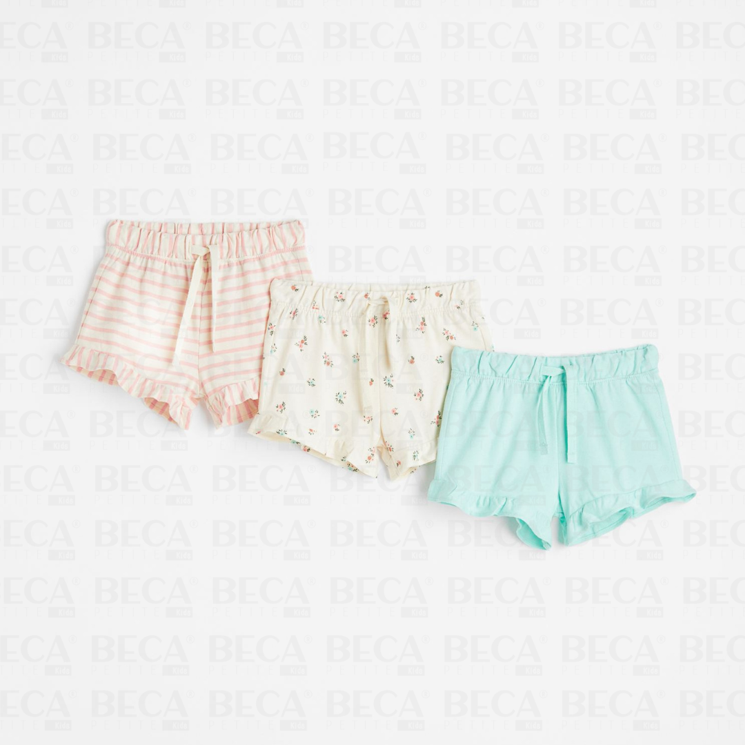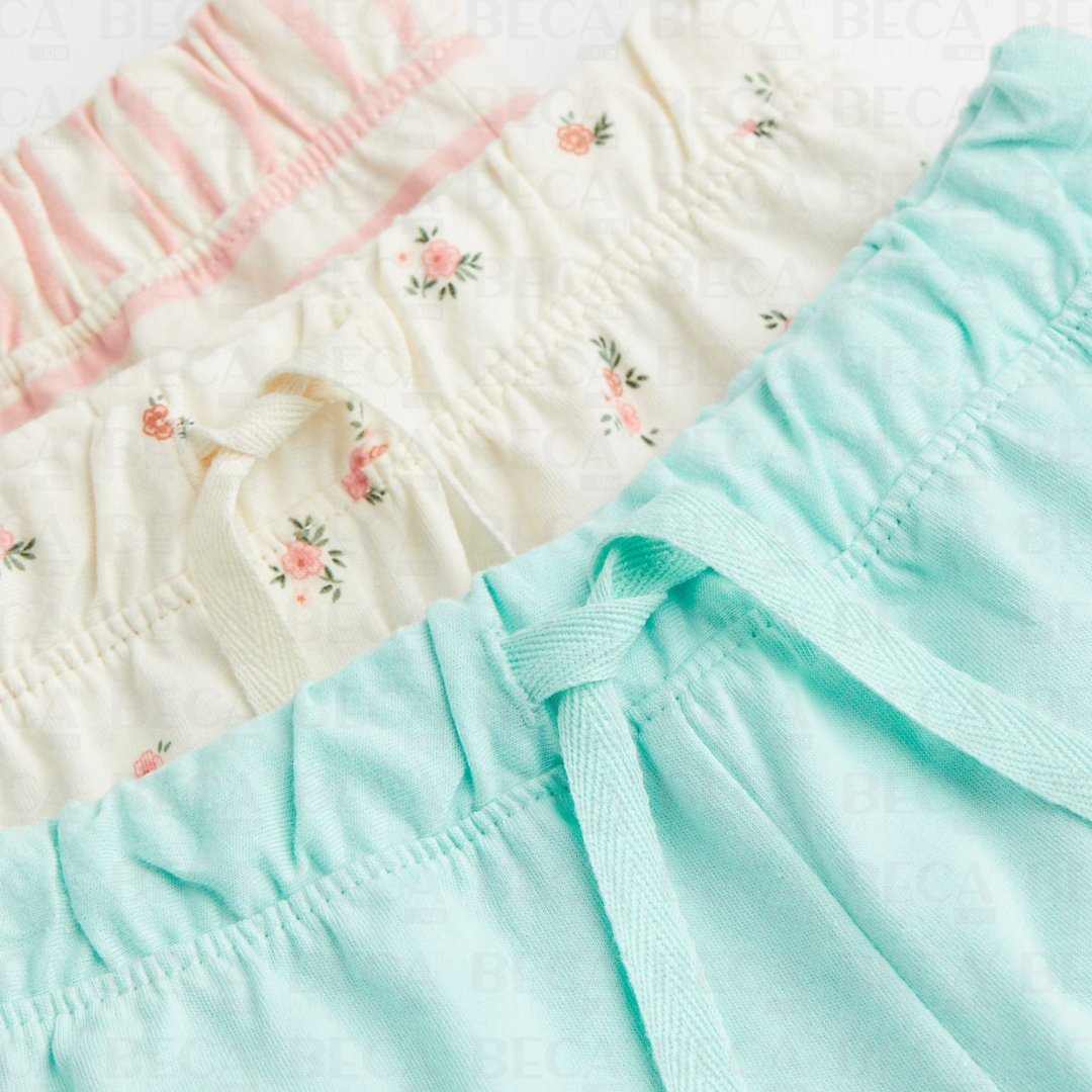 Shorts en jersey de algodón suave. Elástico revestido y cordón de ajuste en la cintura y bajos con volantes.
